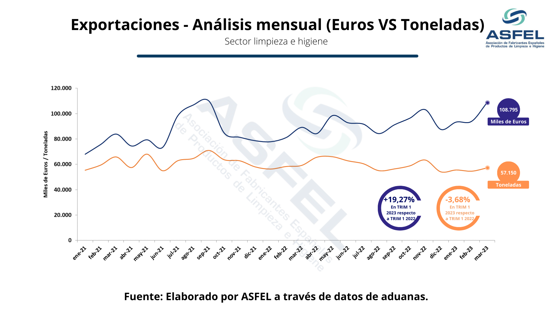 Valencia, 8 de junio de 2023.- El conjunto del sector de la limpieza e higiene profesional exportó en el primer trimestre de 2023 un total de 296,29 millones de euros. La cifra supone un incremento del 19,27% respecto al mismo periodo del año anterior. En cuanto al último trimestre de 2022, las exportaciones han aumentado un 3,08%.